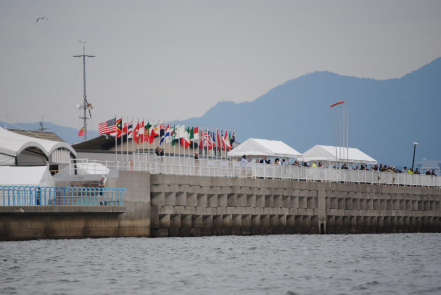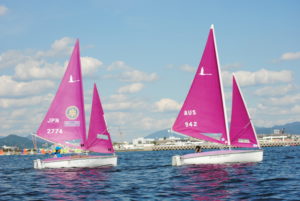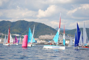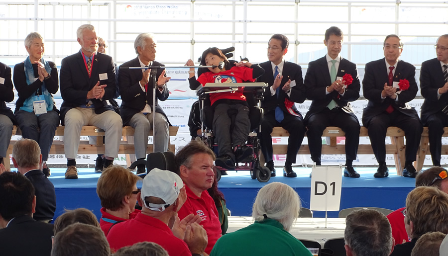 At the Opening Ceremony on Saturday (13th) Nayuta Yamato, a member of Hiroshima Sailability come to the stage and said, “I have a severe disability and was suffering to live when I met Hansa. I cannot even sit on an ordinary chair, however Hansa gently wrapped me and took out me to the sea. There I found how wonderful the sea is. Hansa gave me a new life. I hope that many people receive gifts of life through the Hansa Worlds. ”